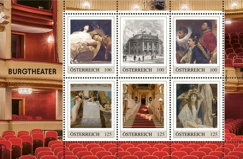 100 C, Gemälde „Romeo und Julia“ von Gustav Klimt im Treppenhaus des Burgtheaters, 100 C, Holzstich „Das neue Hofburgtheater in Wien“,